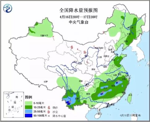 據(jù)中央氣象臺網(wǎng)站消息4月16日20時至17日20時,江南大部、華南北部、云南大部等地有中到大雨,其中云南西南部、廣西東北部、湖南西南部和江西東北部等地的局地有暴雨;新疆北部、東北地區(qū)大部、黃淮大部等地將有小到中雨;內(nèi)蒙古東部和西藏東部、川西高原的部分地區(qū)有雨夾雪。內(nèi)蒙古大部、西北地區(qū)東北部、華北北部和西部等地有4~6級風(fēng),局地有7級以上大風(fēng)。